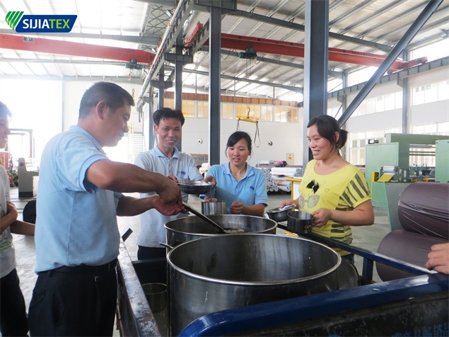 由于訂單正處于緊張的生產(chǎn)階段,一線員工任務(wù)量不言而喻,生產(chǎn)車間內(nèi)一派熱火朝天、緊張忙碌的場(chǎng)景。公司職工食堂每天定時(shí)熬制綠豆湯,加入白糖,放涼后倒入保溫桶內(nèi),并送到生產(chǎn)車間。隨著桶裝的綠豆湯分別送至每個(gè)車間,生產(chǎn)一線的員工們陸續(xù)拿著自己的杯子接過綠豆湯,并歡快地飲用起來。